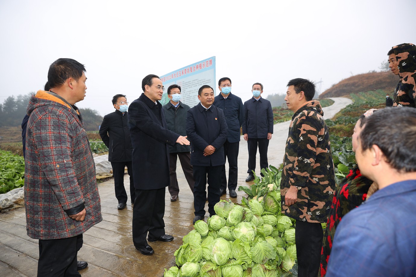 徐麟在桐梓县茅石镇团结村蔬菜基地,与正在采收蔬菜的群众亲切交谈。杜朋城 林民 摄