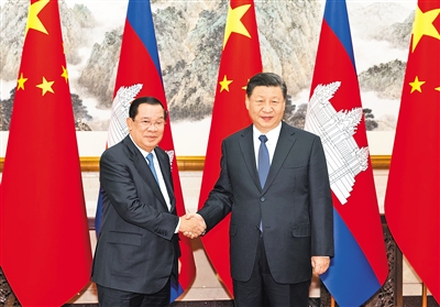 习近平强调,中方坚定支持柬埔寨人民自主选择符合本国国情的发展道路,坚定支持柬埔寨维护国家主权和安全,坚定支持柬埔寨平稳推进国内重大政治议程和经济社会发展,坚决反对外部势力干涉柬埔寨内政。中方把柬埔寨作为周边外交重点方向,始终从全局和战略高度规划和推进中柬各领域合作,愿在以中国式现代化全面推进中华民族伟大复兴进程中,同柬方共享机遇、共谋合作、共促发展,携手构建高质量、高水平、高标准的新时代中柬命运共同体,为两国人民带来更多福祉,为地区和平稳定发展贡献更多正能量。