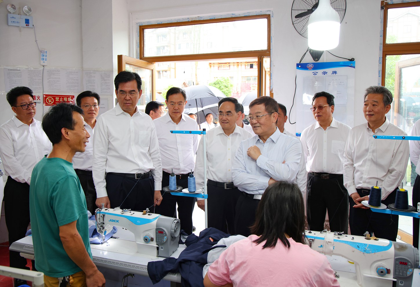 与会同志在柏杨林街道易地扶贫搬迁安置点就业扶贫车间与务工群众亲切交流。