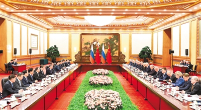 李强表示,在习近平主席和普京总统的战略引领下,中俄关系持续高水平运行,双方政治互信更加牢固,民间友好不断深化,务实合作更有韧性,国际协调更为密切,树立了新型大国关系典范。中方愿同俄方以明年两国建交75周年为契机,落实好两国元首重要共识,不断传承发扬中俄世代友好,推动中俄关系实现新的更大发展,持续增进两国人民福祉,给世界注入更多稳定性和正能量。