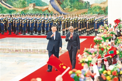 新华社北京1月10日电 (记者朱超)1月10日下午,国家主席习近平在人民大会堂同来华进行国事访问的马尔代夫总统穆伊兹举行会谈。两国元首宣布,将中马关系提升为全面战略合作伙伴关系。
