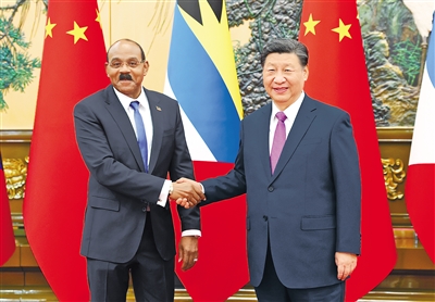 习近平指出,安提瓜和巴布达是东加勒比地区最早同新中国建交的国家之一。建交41年来,中安两国始终相互尊重、相互支持,成为大小国家平等相待、合作共赢的典范,两国关系保持健康稳定发展,务实合作取得丰硕成果,人民友谊日益加深。新形势下,中方愿同安方密切各层级交往和治国理政经验交流,加强发展战略对接,深化务实合作,推动中安关系取得更多成果,更好惠及两国人民。